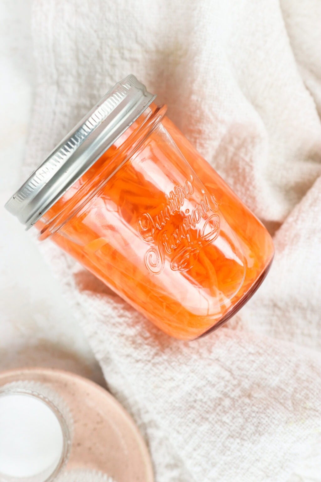 Mix in more veggies: Yes, you can pickle more than one veggie in the same jar! Try mixing in some shredded cabbage, sliced daikon radishes, or some sliced red onion. Adding in another veg can save some space in the fridge while also adding some fun flavor and color to the pickled carrots.